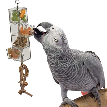 The clear design makes it easy for the Parrot to see their rewards, and the durable polycarbonate is easy to clean. The metal skewer can also be used to hold foods or toy parts more securely inside the foraging door sections, making it more challenging for the Parrot to gain their prize.